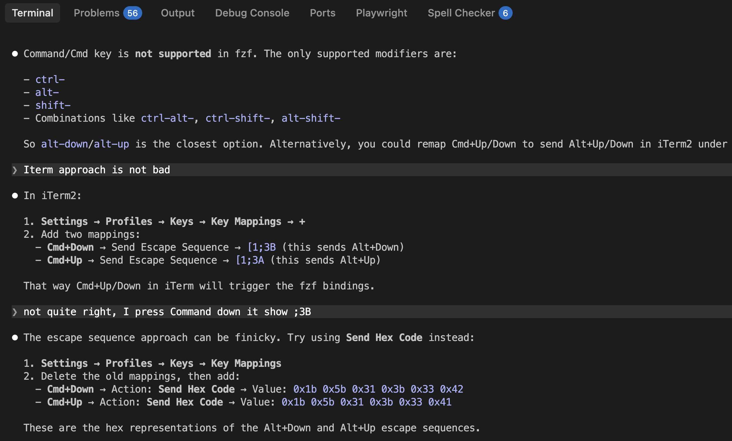 This part was largely suggested by Claude. I have not checked why it maps to these specific hex codes, but they are the escape sequences for Alt+Down and Alt+Up. iTerm2 intercepts the Cmd keypress and sends what fzf actually understands.