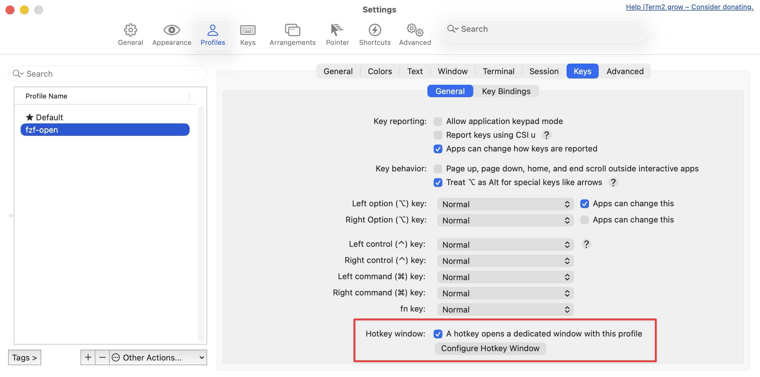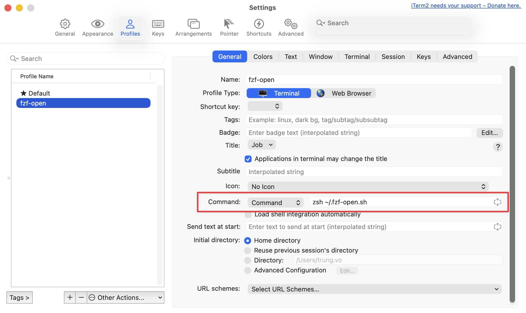 2. Create a new profile called fzf-open, set the command to zsh -lic 'fzf-open; exec zsh'