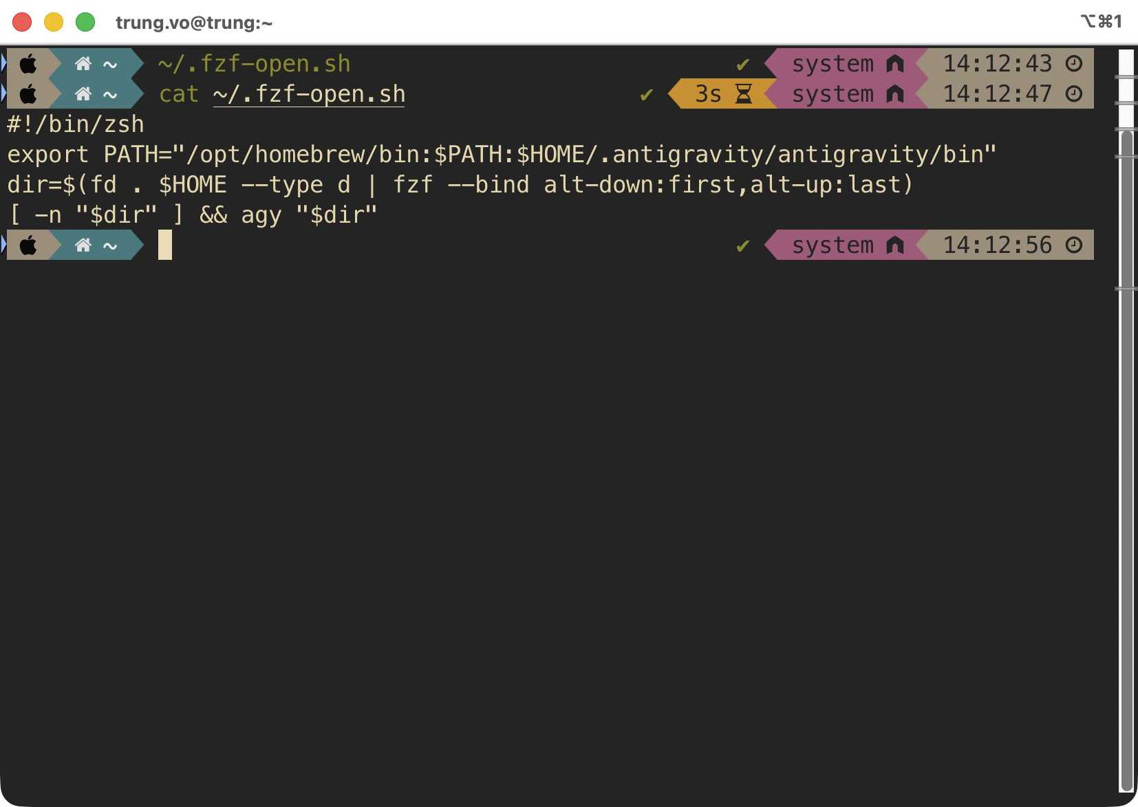When you type fzf-open, it lists all directories under $HOME (filtered by .ignore), pipes them into fzf, and opens the selected folder. Replace agy with whatever you use to open projects, could be code, cursor, or just cd.