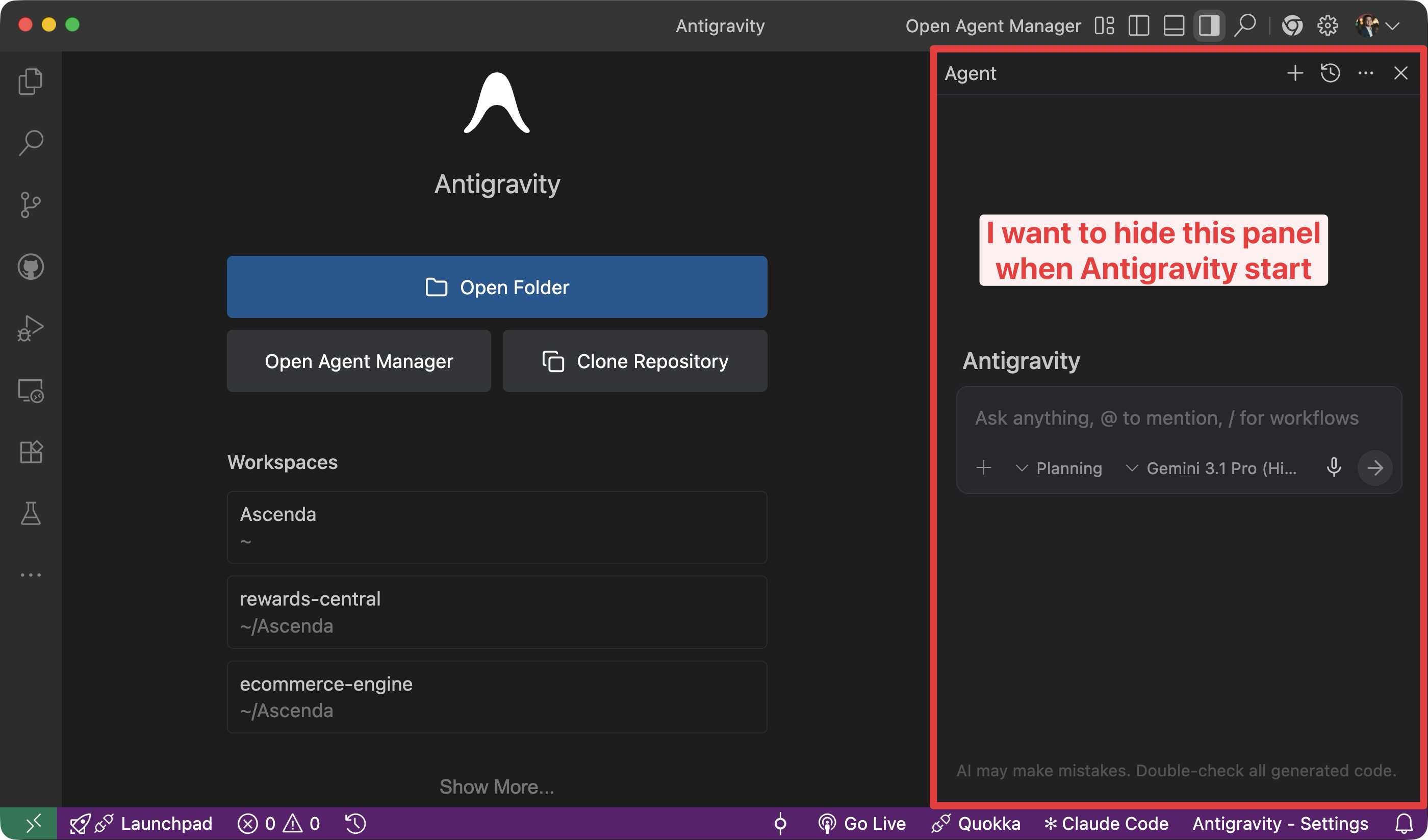 That said, since I use Claude Code as my primary agent, I don’t need the Agent view that Antigravity opens by default on startup.