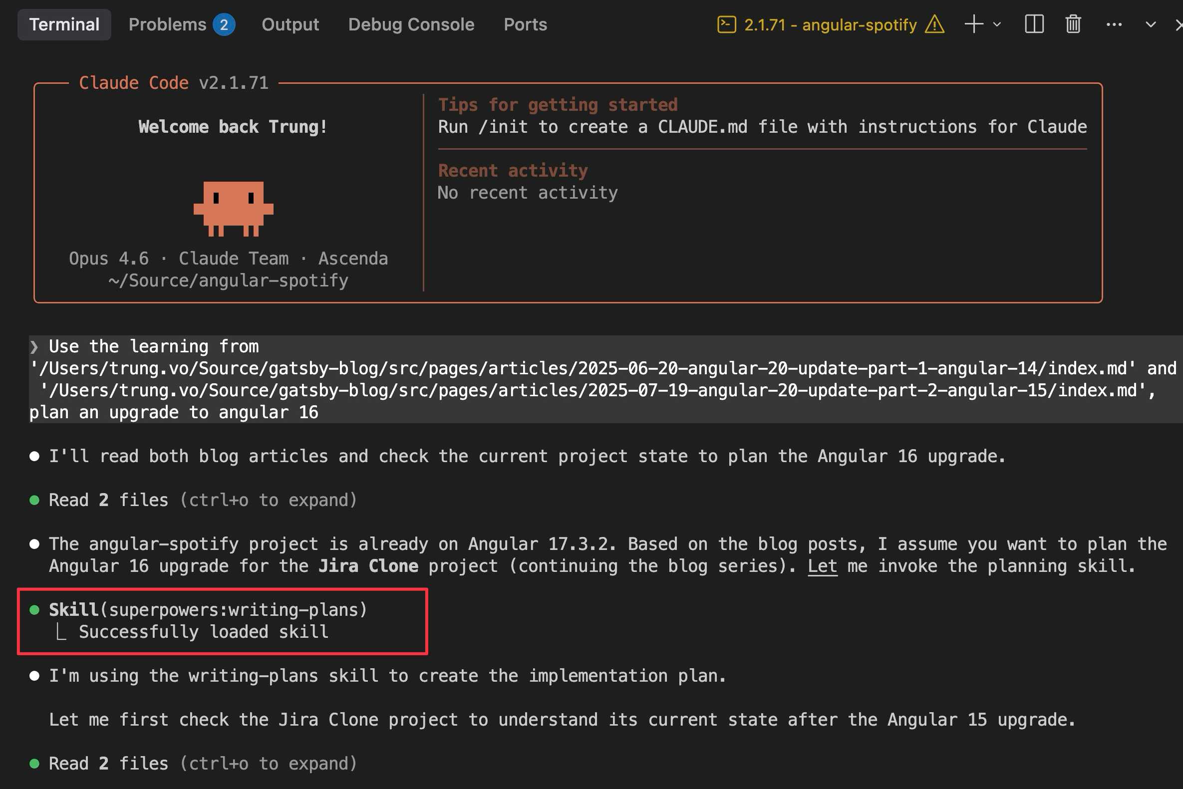I had two detailed blog posts from the previous migrations (Part 1 and Part 2) that documented every step, every error, and every resolution. That is a lot of context. So I thought, what if I just ask Claude to read those posts, understand the pattern, and generate a plan for the Angular 16 upgrade?