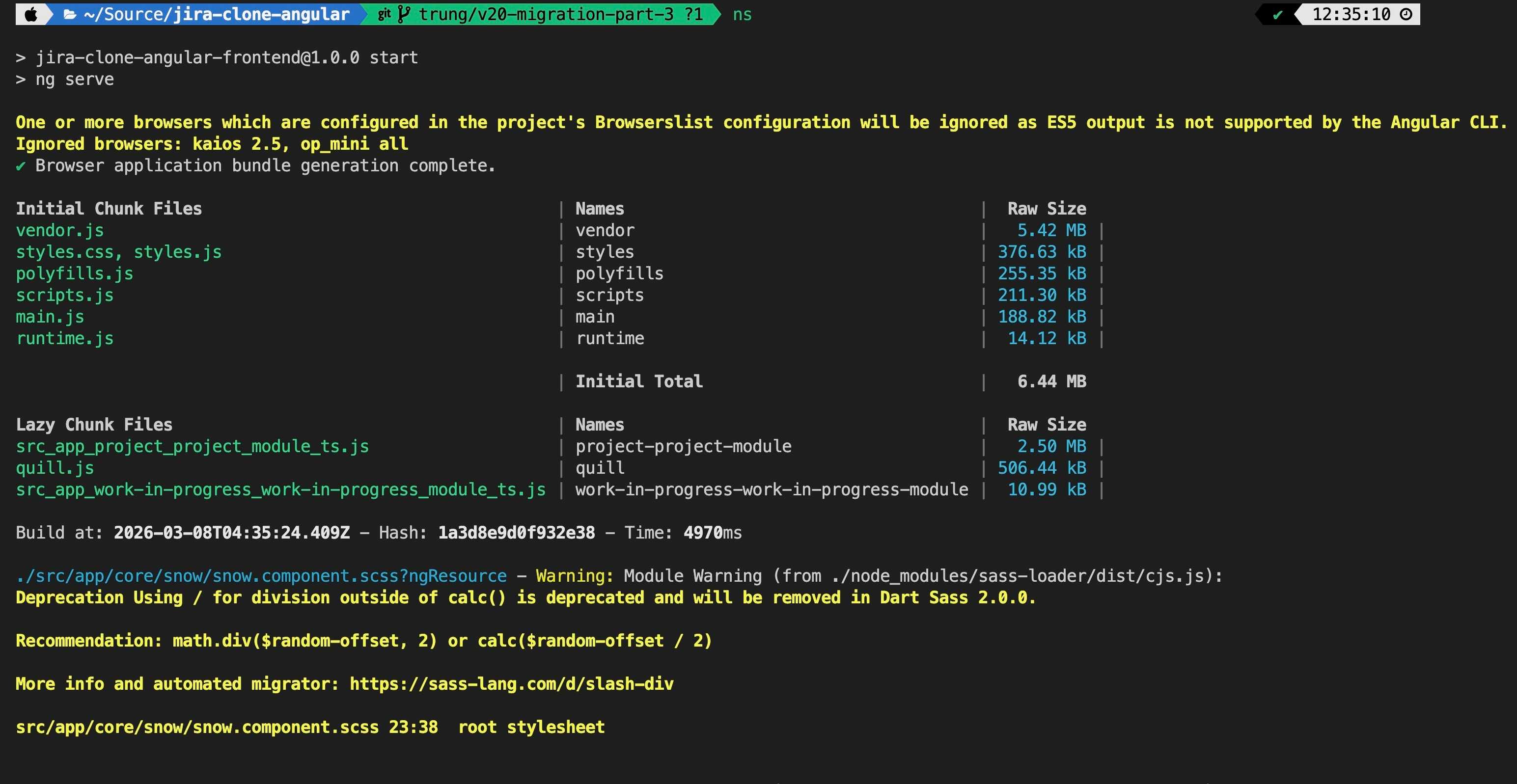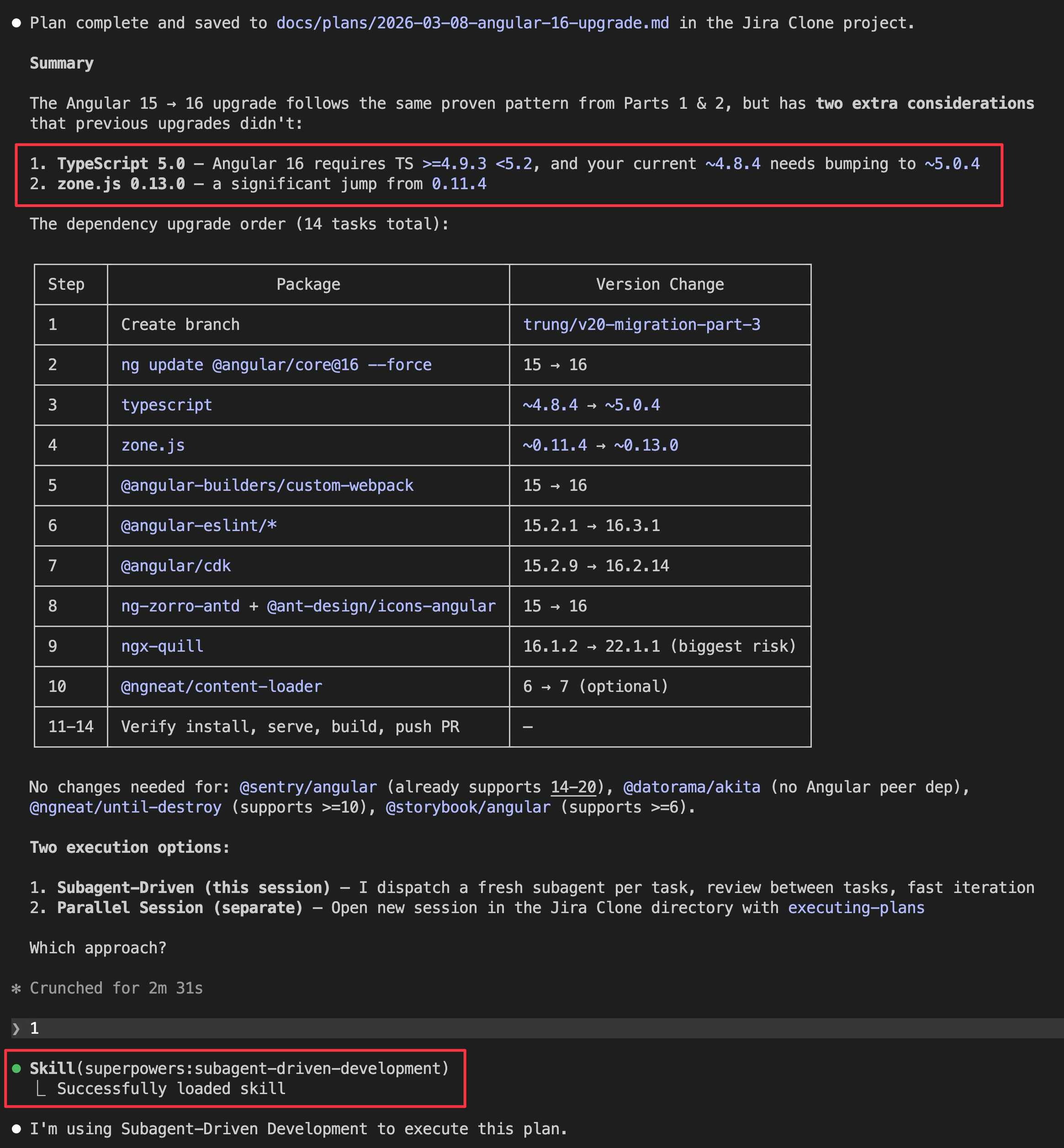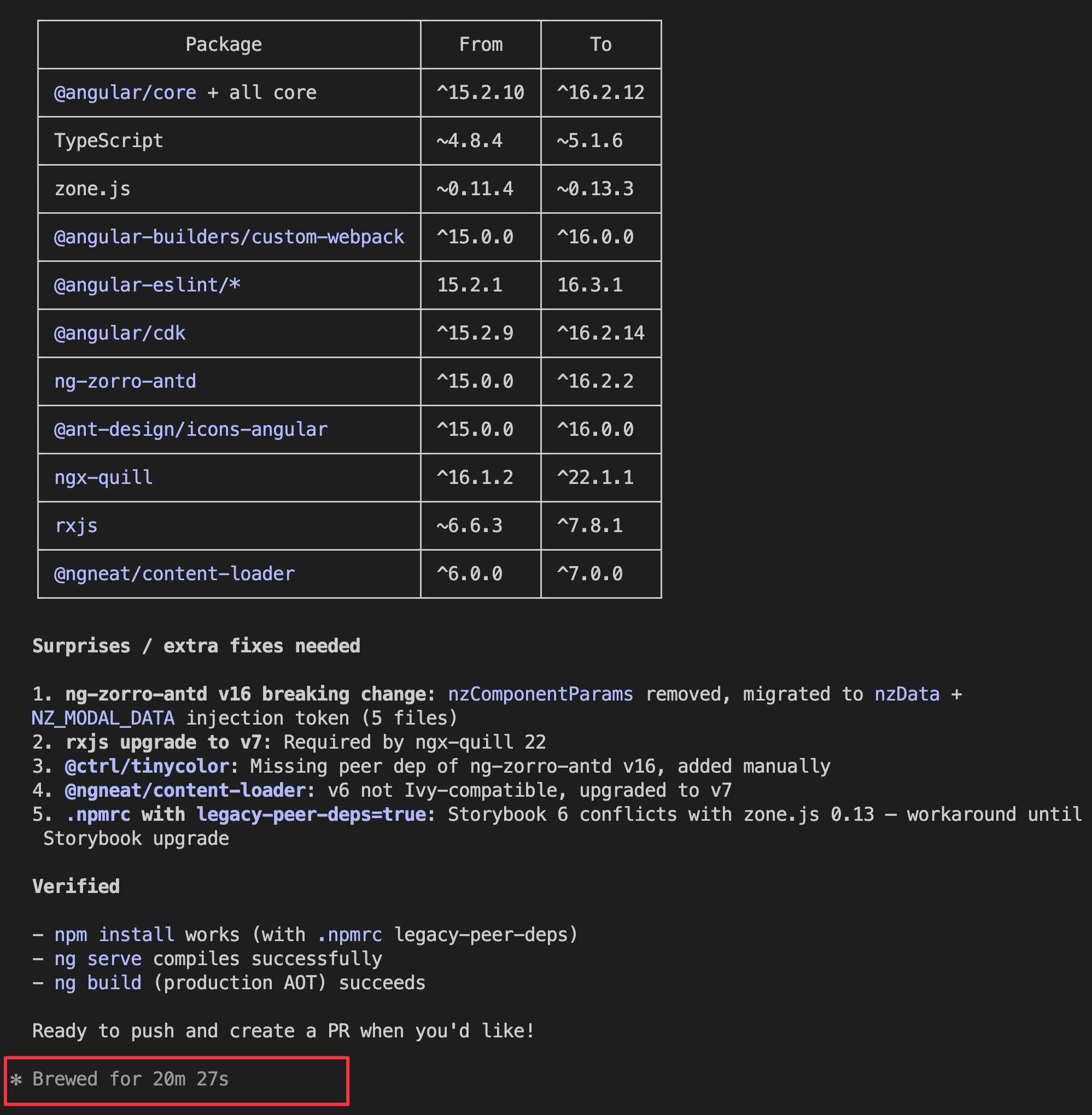 trung/v20-migration-part-3--force (same ESLint chicken-and-egg problem as before)~4.8.4 to ~5.0.4 (Angular 16 requires TS 5.0+)~0.11.4 to ~0.13.0 (significant jump)16.0.016.3.116.2.14ng-zorro-antd to 16.2.2, @ant-design/icons-angular to 16.0.0)16.1.2 to 22.1.1 (this was the biggest risk, major version jump)7.0.0Claude also identified the key changes in Angular 16 (Signals in developer preview, TypeScript 5.0 support, zone.js bump) and listed potential gotchas, including the ngx-quill major version jump from 16 to 22 since ngx-quill uses its own versioning that does not follow Angular’s.
