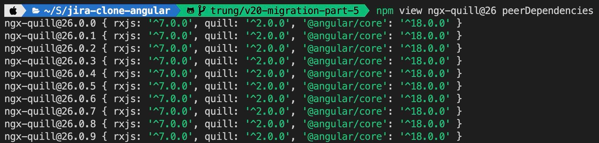 The other notable change: Quill v1 to v2. Not because Angular 18 requires it, but because ngx-quill 26+ (the only version that supports Angular 18) dropped support for Quill v1. So we had to upgrade both at the same time.