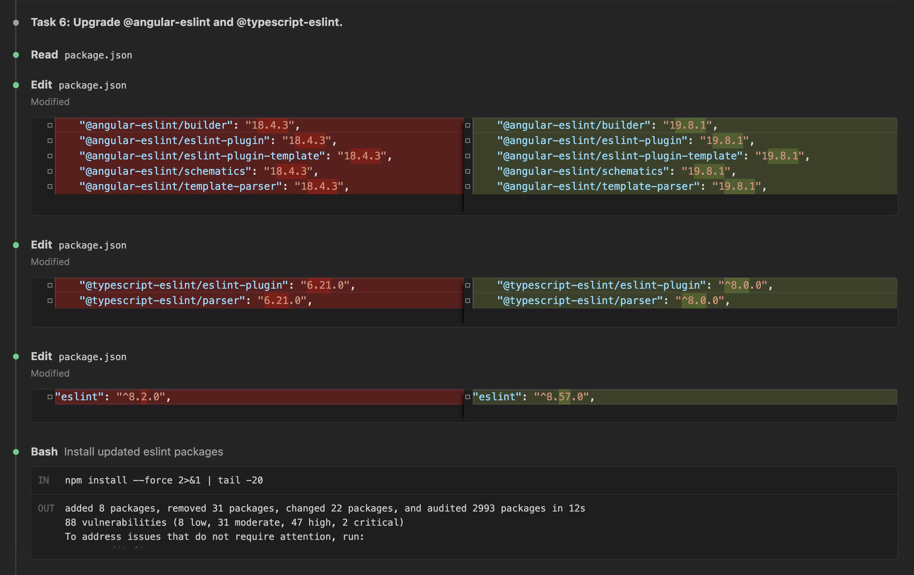 typescript-eslint v8 jumpThis was the riskiest dependency change. @angular-eslint v19 requires typescript-eslint v8, and we were on v6.21.0. That is a two-major-version jump.
