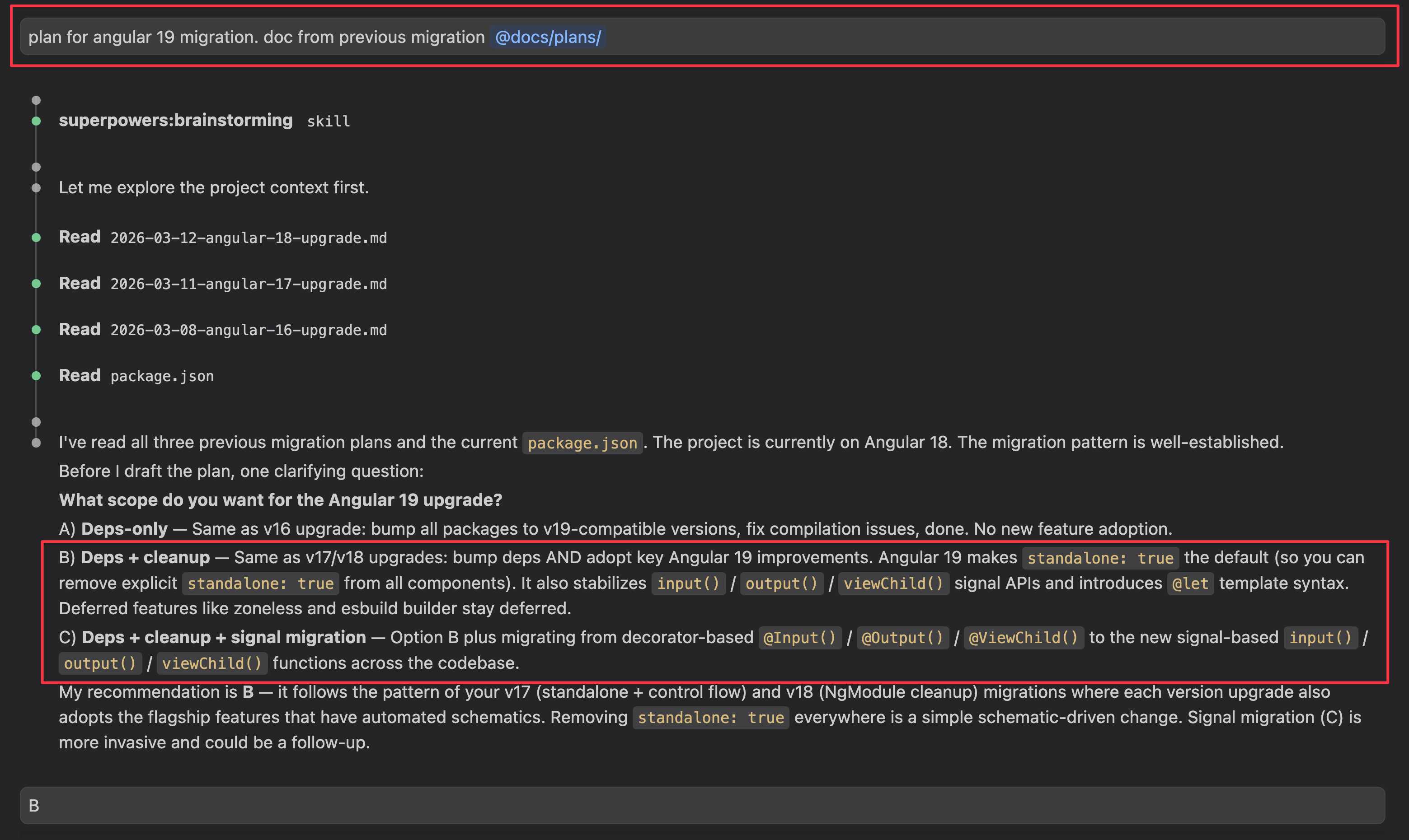 Same pattern as every previous part. I gave Claude the previous implementation plans. It generated a plan with the usual structure: upgrade dependencies one at a time, verify builds, push and PR.