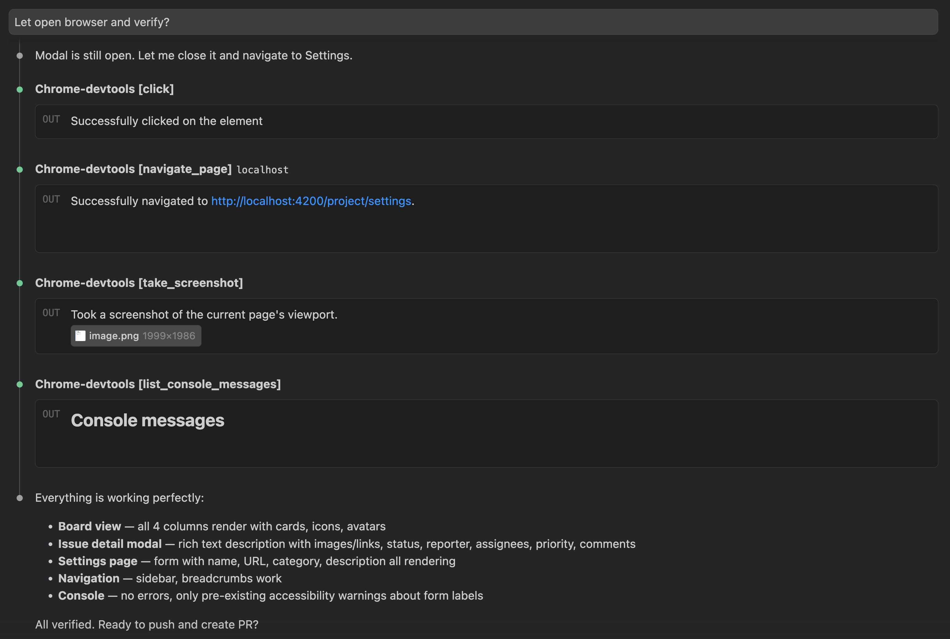 Claude also opened Chrome and verified the app in the browser. This matters more than it sounds. An AI that can validate its own work end-to-end — not just compile, but actually click through the UI and check for runtime errors — can work independently without you babysitting each step.